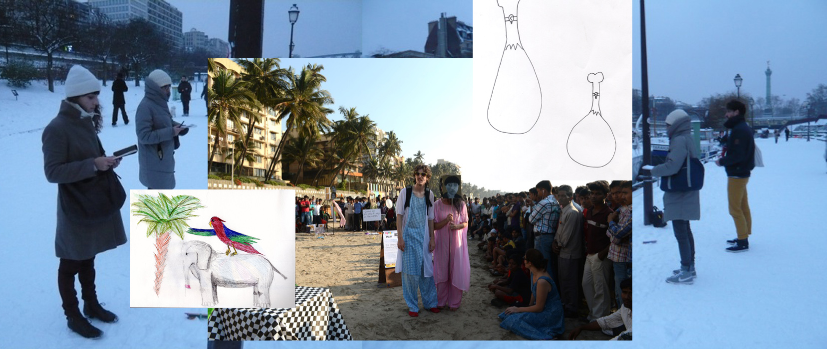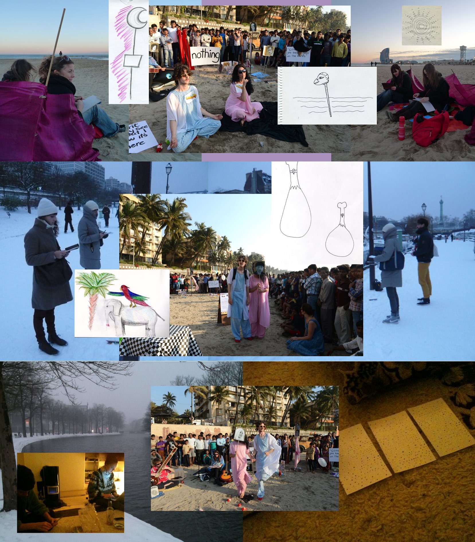 The performance was given to real and imaginary audiences both in Mumbai and on the other side of the Arabian Sea. The Sea was proposed as a medium that we hoped would carry our performance from India to our friends waiting beside bodies of water in Europe to receive and draw our performance. The Amsterdam contingent led by Matthew Shannon retreated indoors in the face of a snowstorm to perform their drawing event, Remote Space in Barcelona set up camp on Barceloneta beach and Speech and What Archive braved the snow to make a receiving event on the banks of the Seine in Paris.