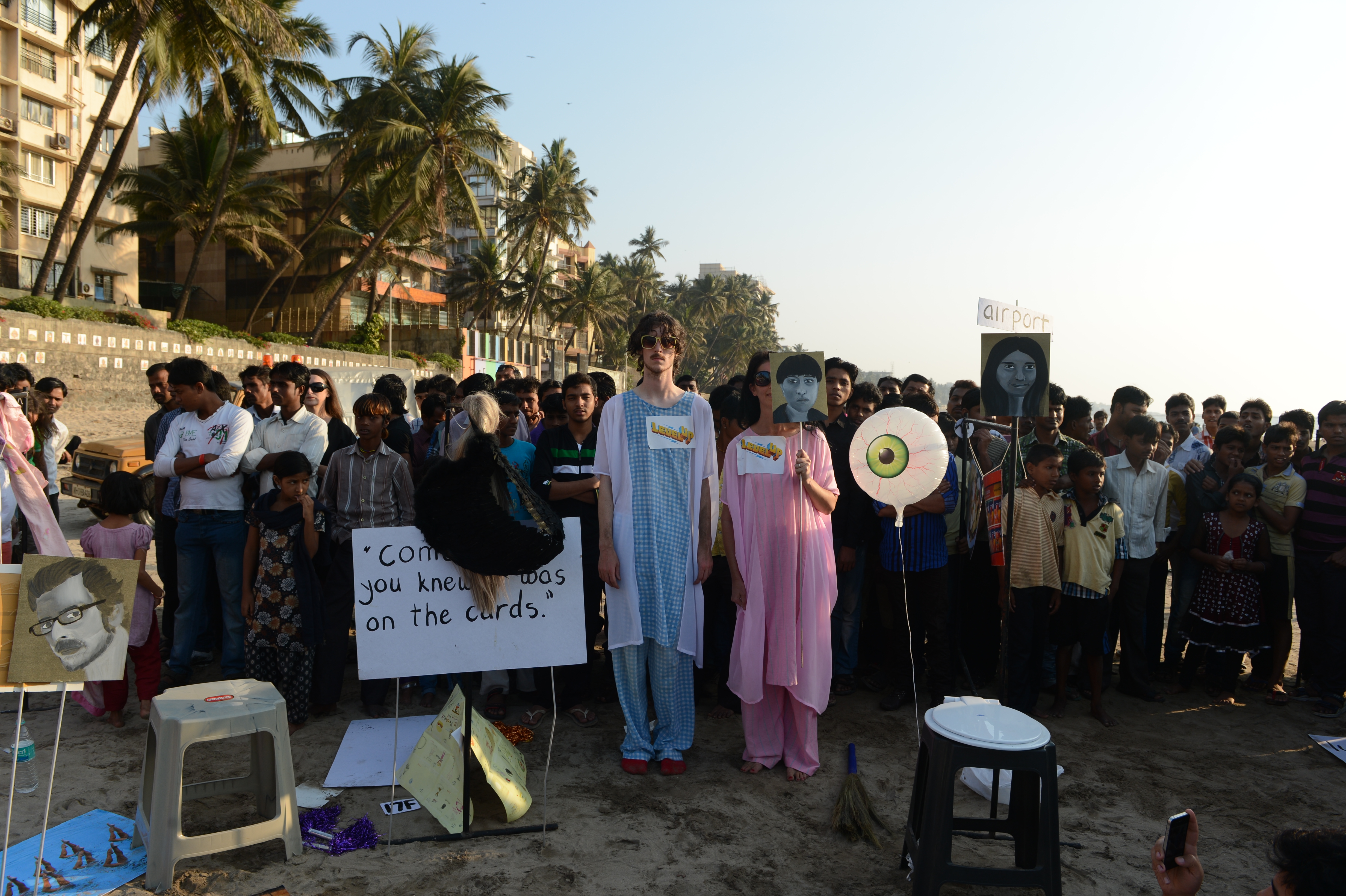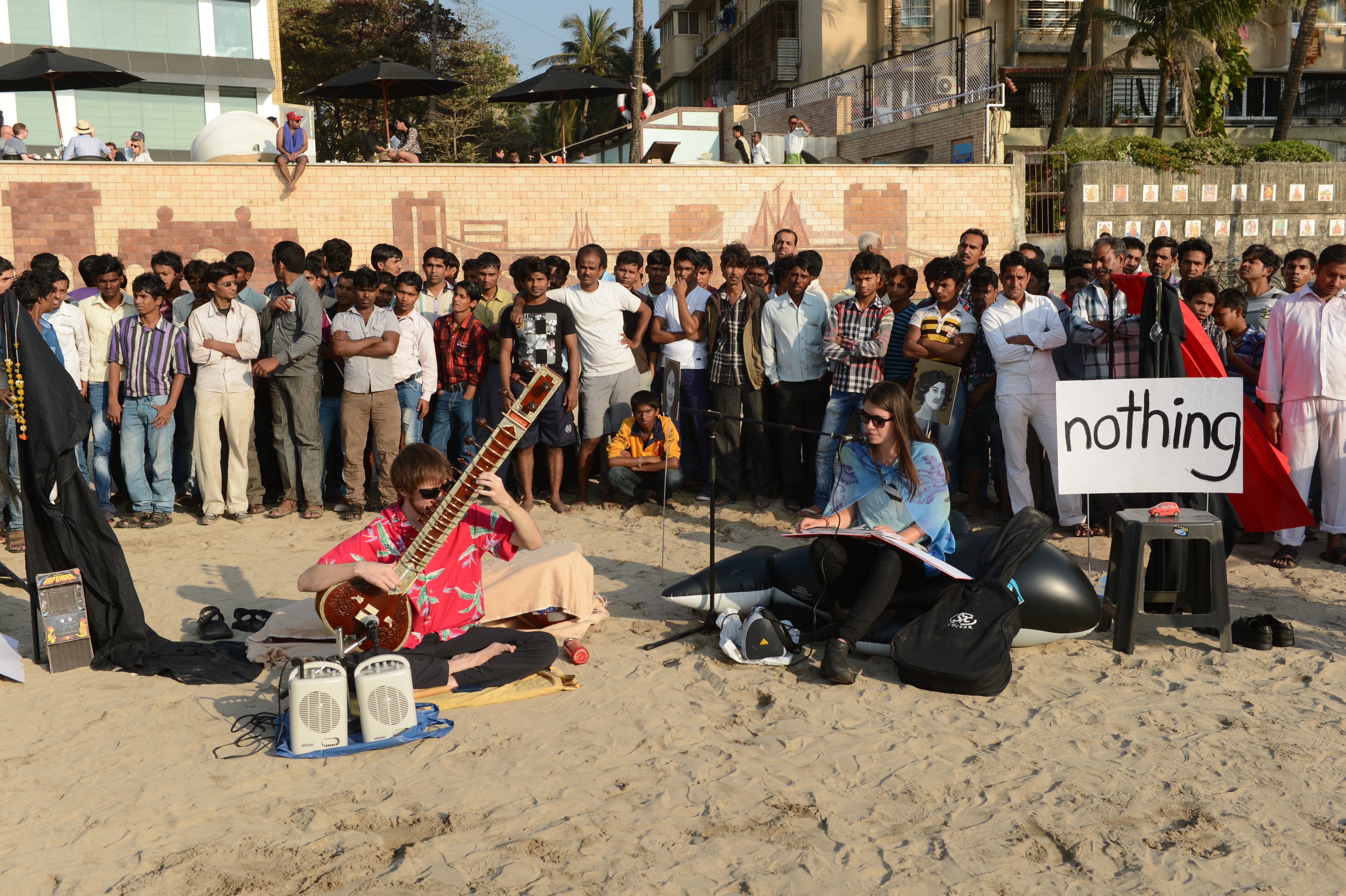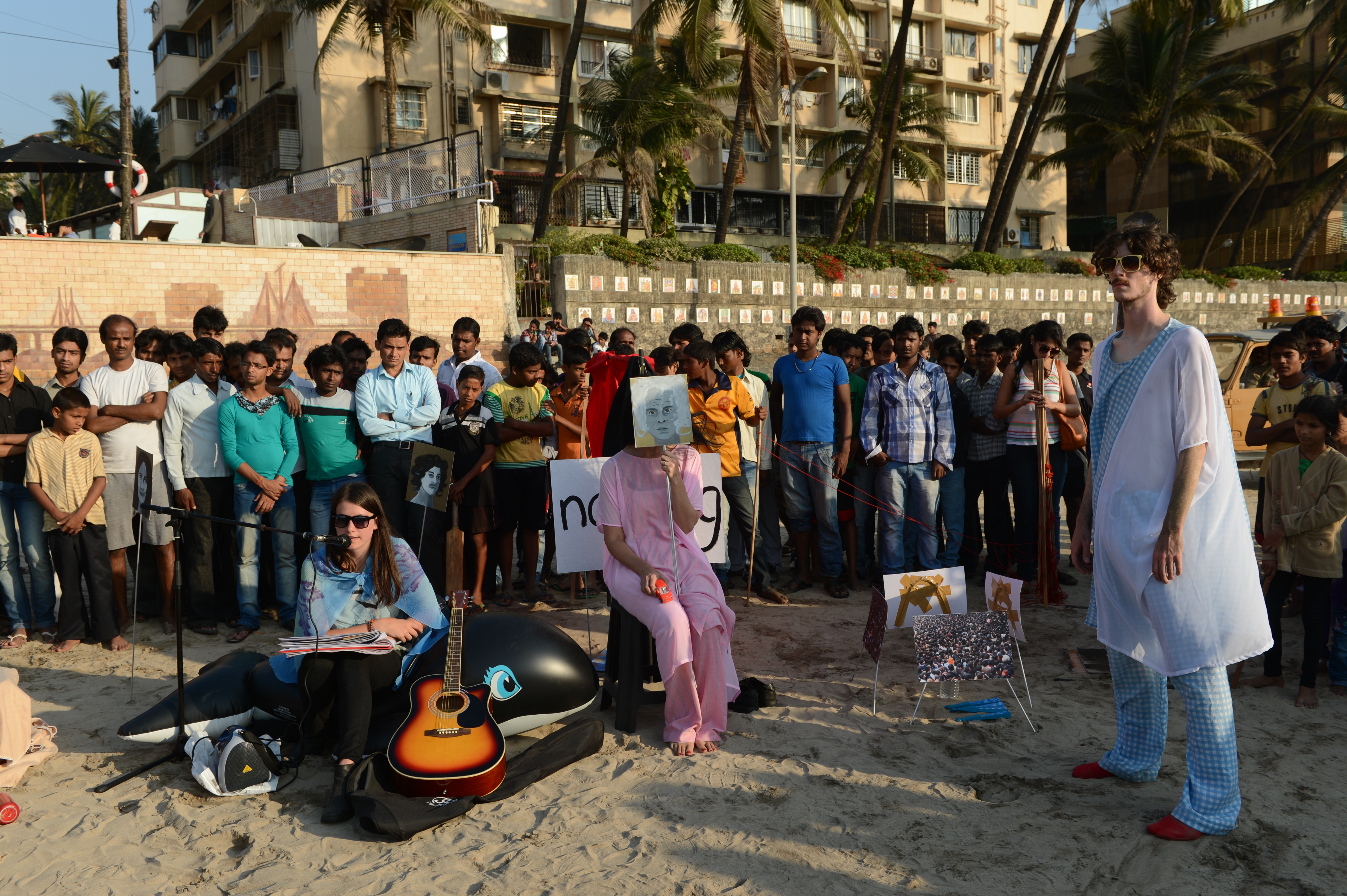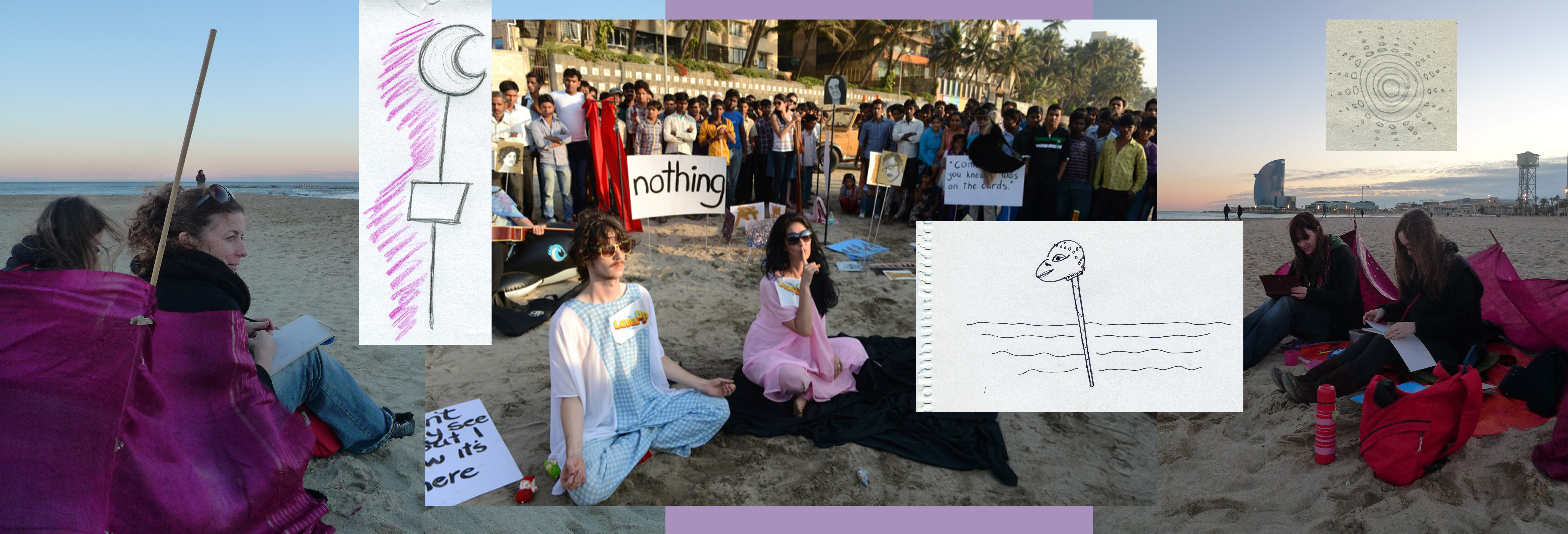 Dreaming the Arabian Sea was a musical performance and drawing project exploring alternative routes, dreams and telepathy that Sean Peoples and Veronica Kent created on Mumbai’s Juhu beach: the texts of their songs (that Veronica’s daughter Mia sang accompanied by JJ on Sitar) and the costumes and props used in the event were inspired by dreams that the couple had during their residency in India.