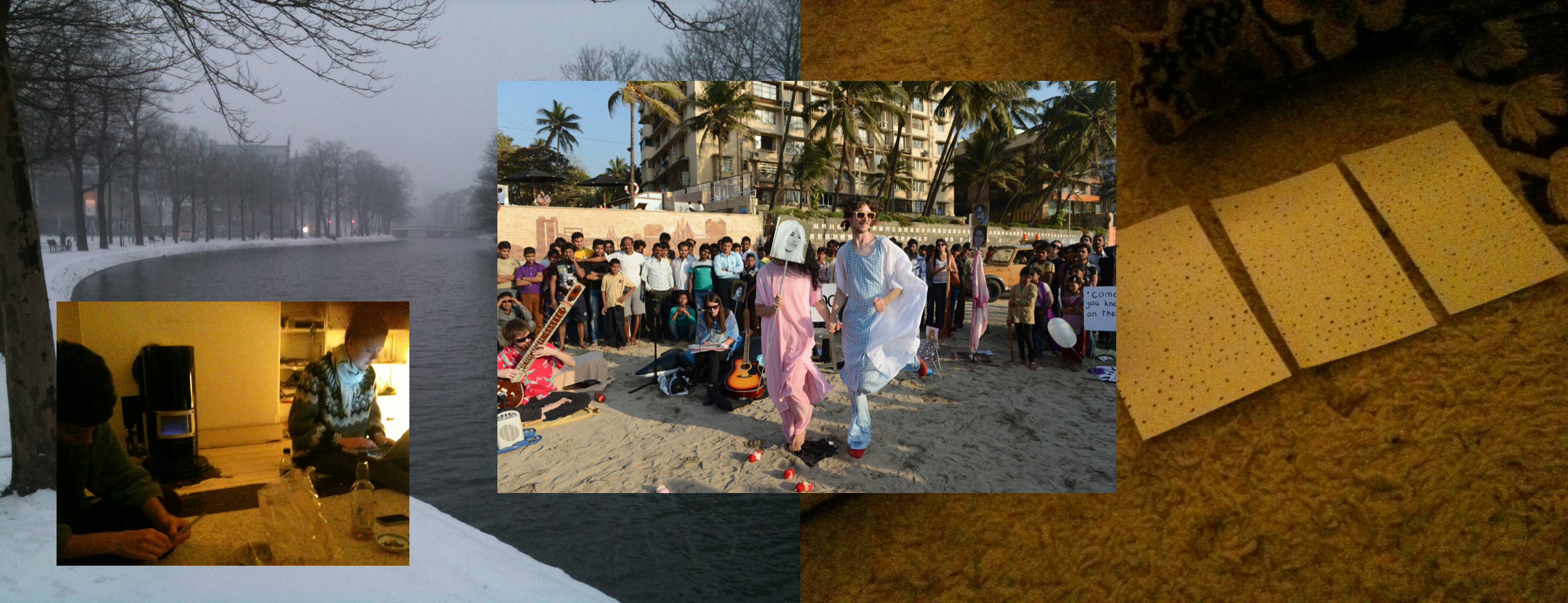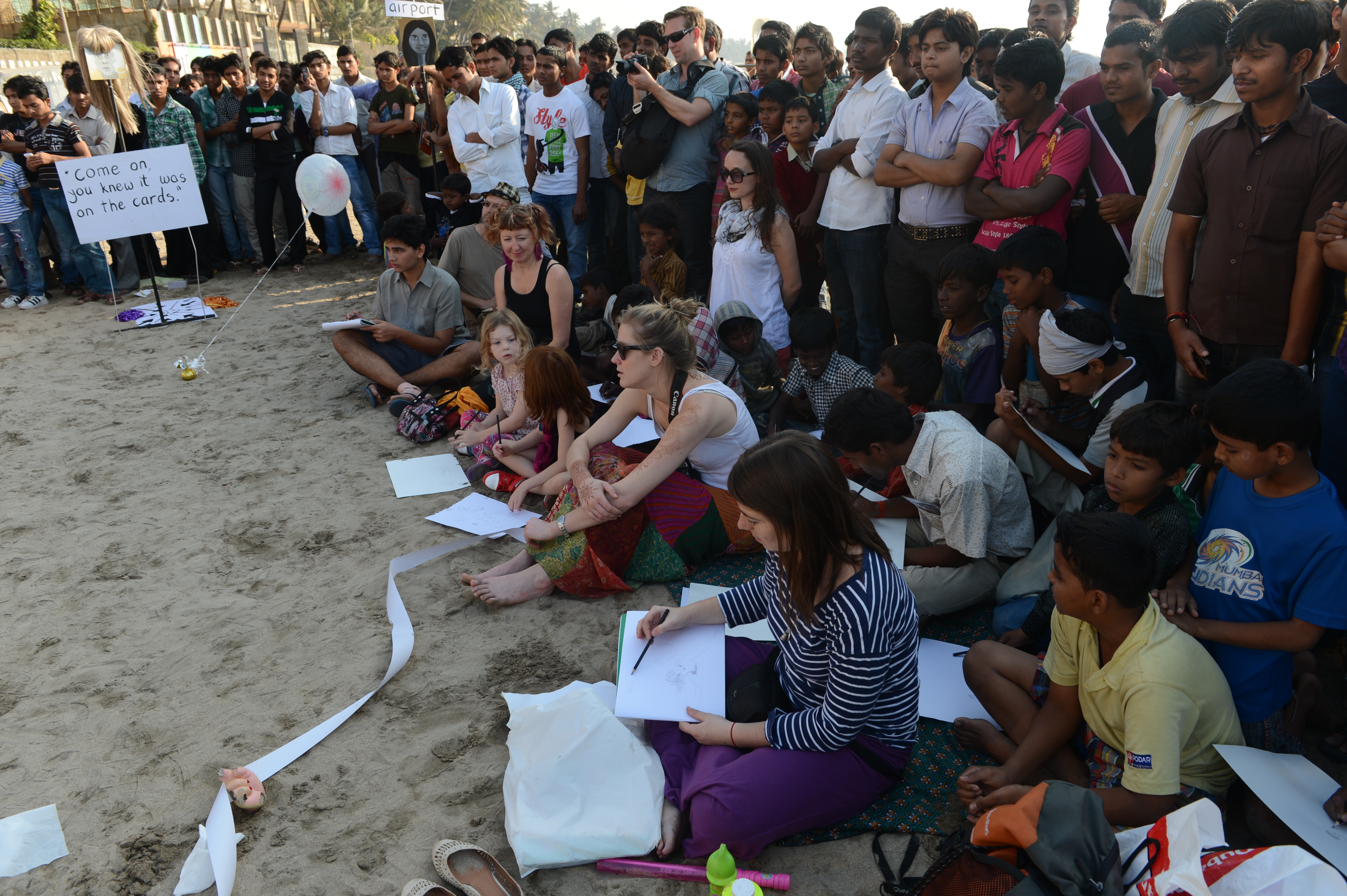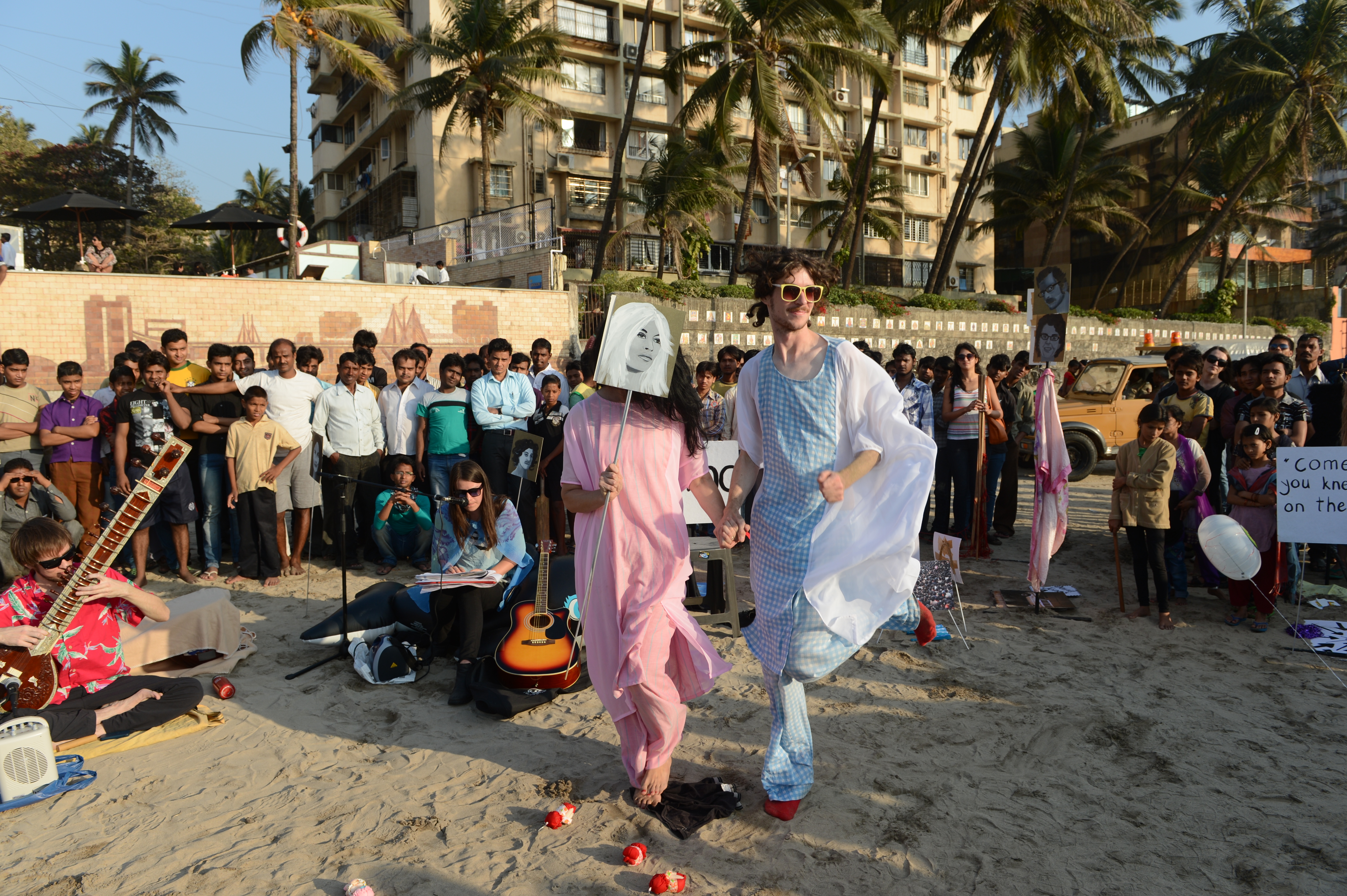 Dreaming the Arabian Sea was a musical performance and drawing project exploring alternative routes, dreams and telepathy that Sean Peoples and Veronica Kent created on Mumbai’s Juhu beach: the texts of their songs (that Veronica’s daughter Mia sang accompanied by JJ on Sitar) and the costumes and props used in the event were inspired by dreams that the couple had during their residency in India.