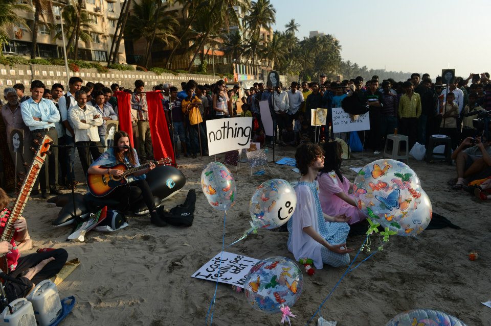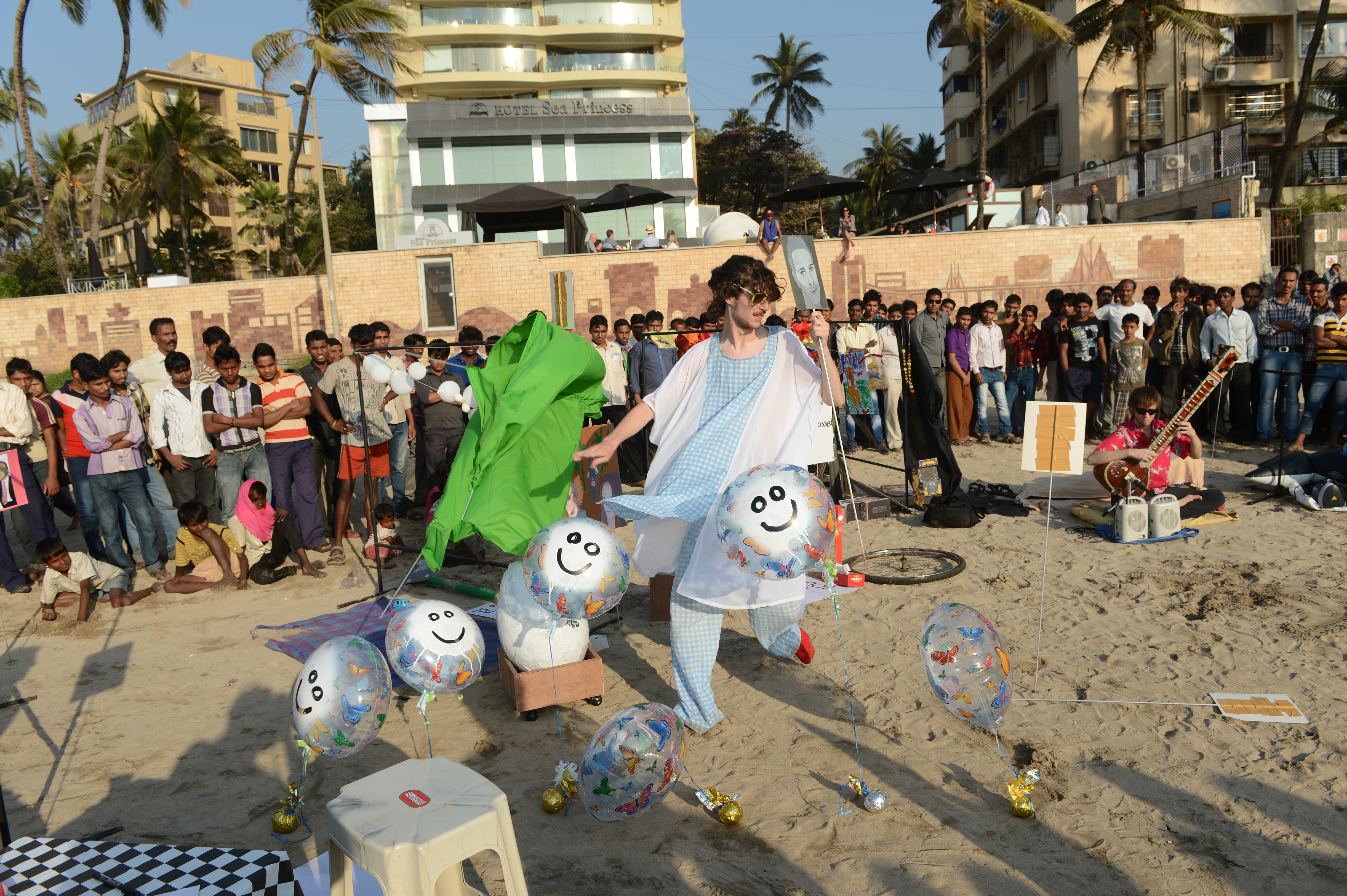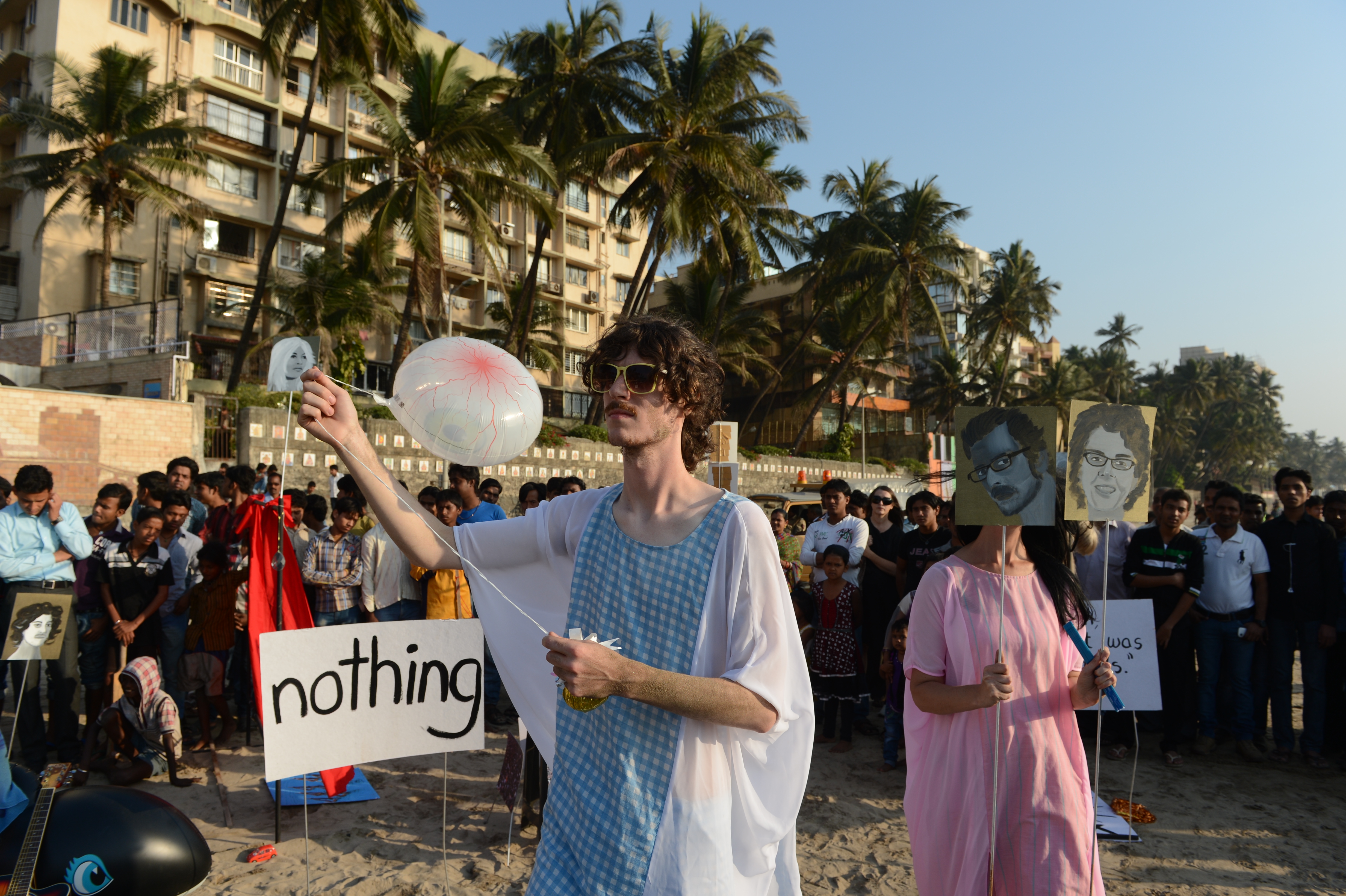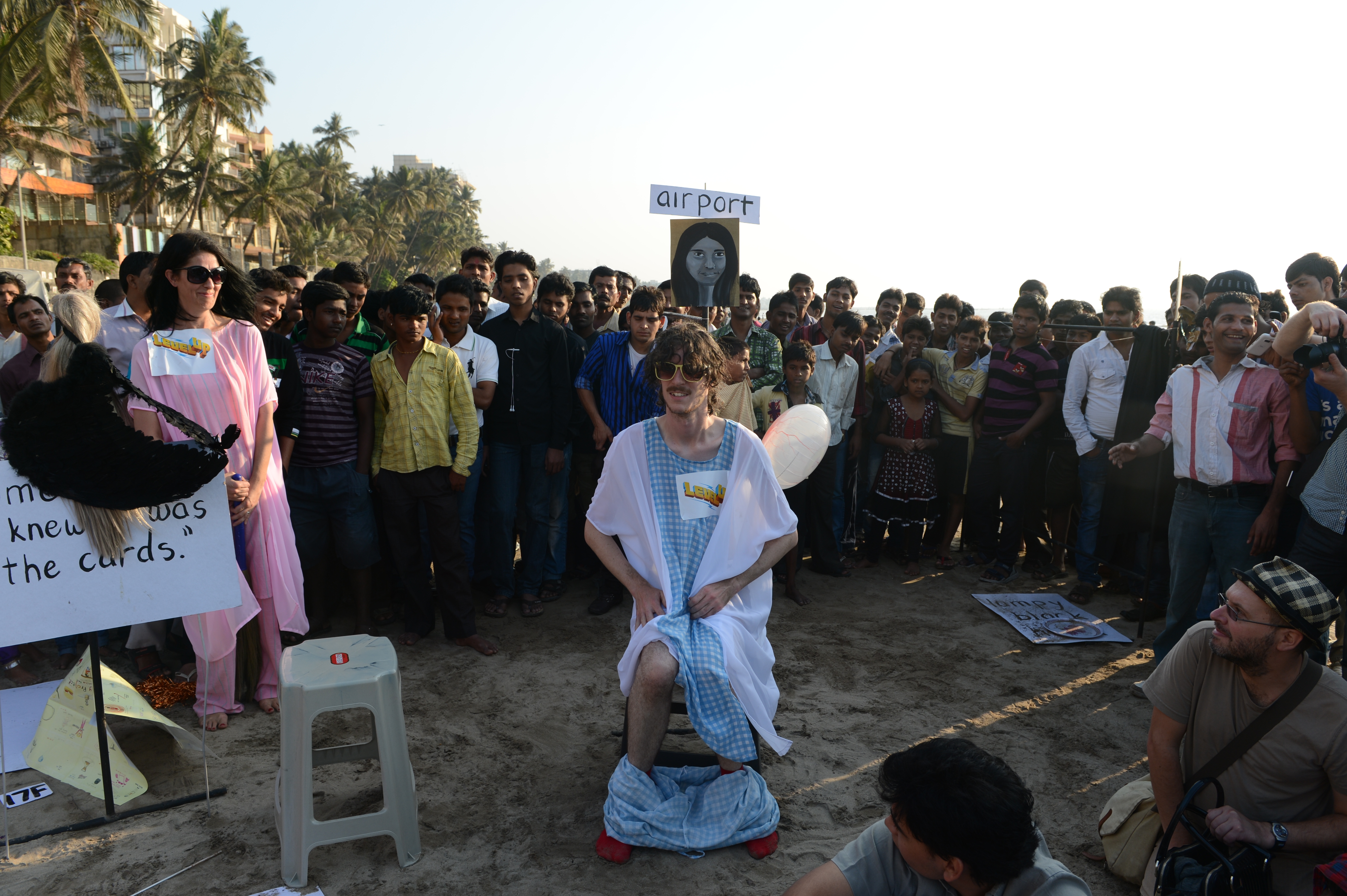Dreaming the Arabian Sea was a musical performance and drawing project exploring alternative routes, dreams and telepathy that Sean Peoples and Veronica Kent created on Mumbai’s Juhu beach: the texts of their songs (that Veronica’s daughter Mia sang accompanied by JJ on Sitar) and the costumes and props used in the event were inspired by dreams that the couple had during their residency in India.