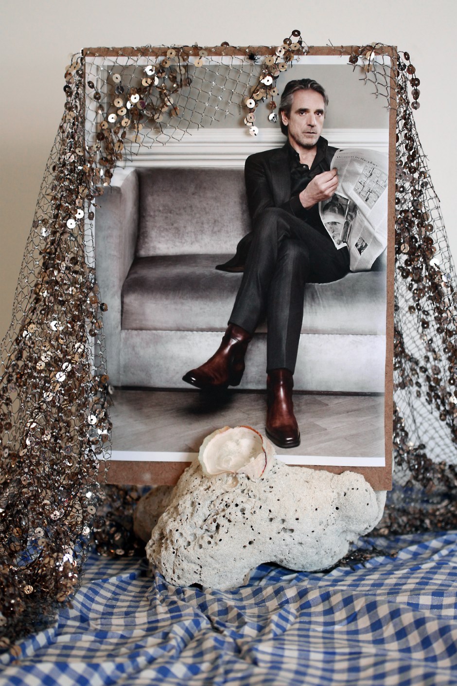 Veronica Kent toys with plasticity and tactility within the exhibition Roman Charity. Kent’s broke Baroque-ery re-administers and re-imagines this portrait of Pero as the ‘eternal feminine’ where Pero’s body ticks all three (cough) boxes: erotic, birthing and nurturing. Within the exhibition space Kent has made a totem of this tale, literally stacking the referents. A small handmade sculpture of an Easter-Island-faced ‘dad’ is trapped in a glass case. A photo of actor Jeremy Irons cut from a magazine is draped with a sequined mesh and propped up by a coral claw with one half of an oyster shell embellishing its peak. Is this Kent chucking her (nice) undies at Mr Irons? Or perhaps this is Kent’s casting of a sparkly fantasy net, or fishing with a dreamboat dream-catcher? No matter; these elements break apart the notions of desire indicated in various other painted versions of Roman Charity. Kent reclaims and encodes, encouraging even further ontological shape-shifting and ha-ha within the story’s brouhaha, but through her own lens of feminine desire.