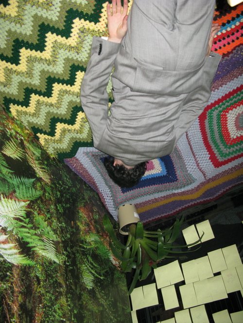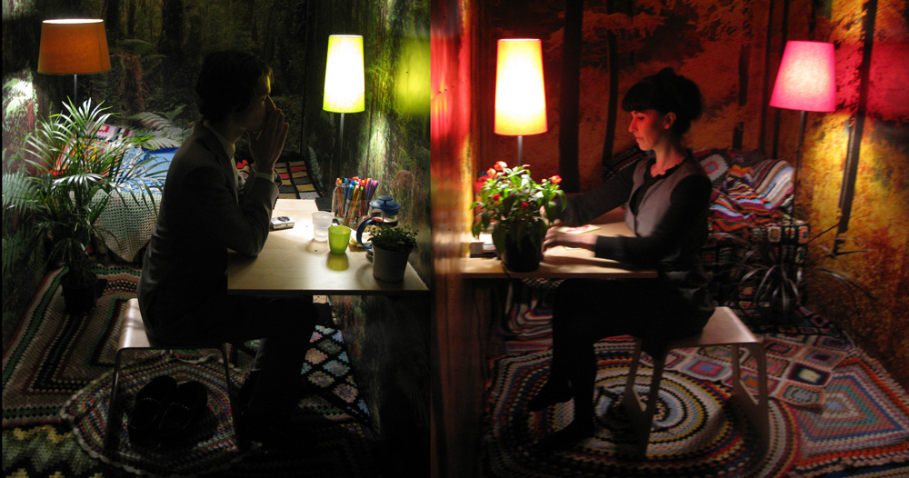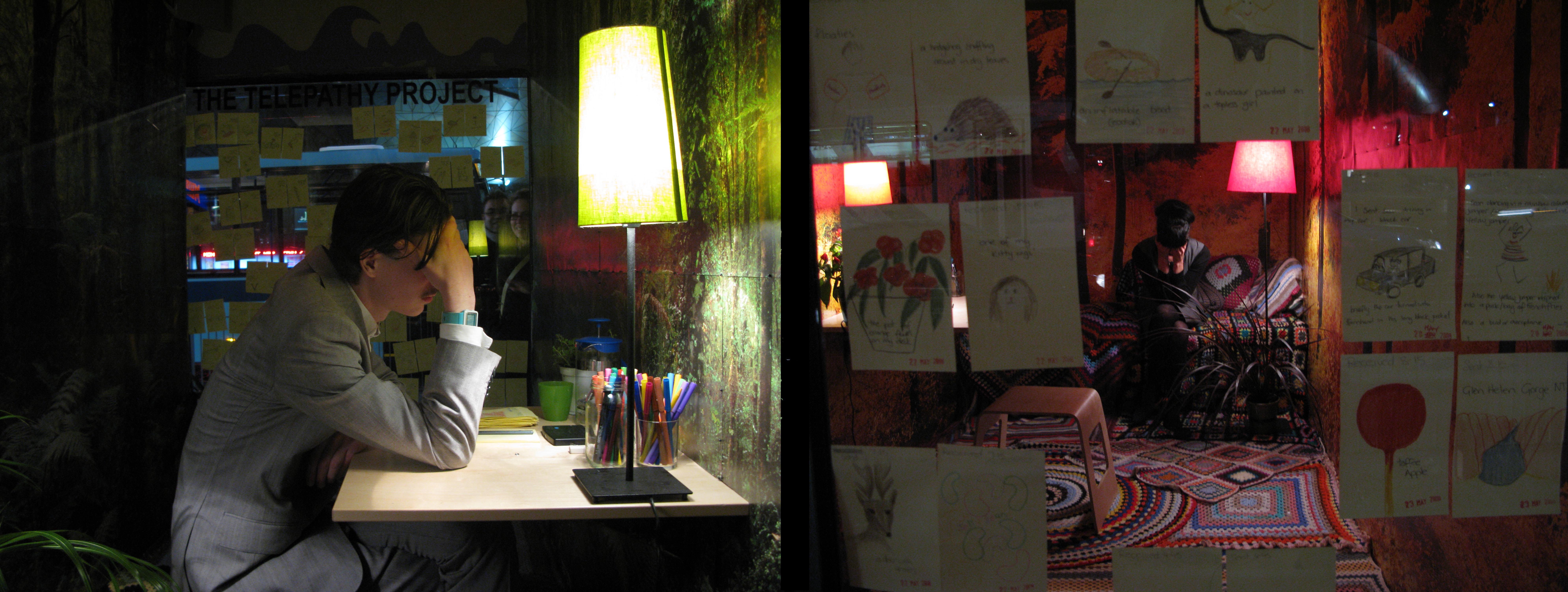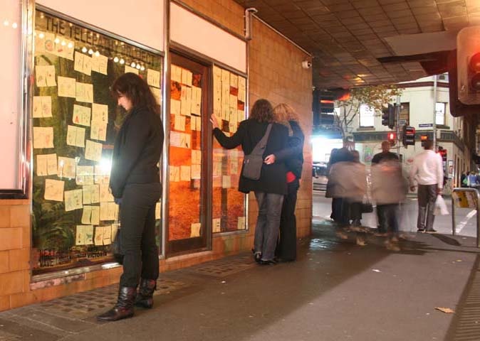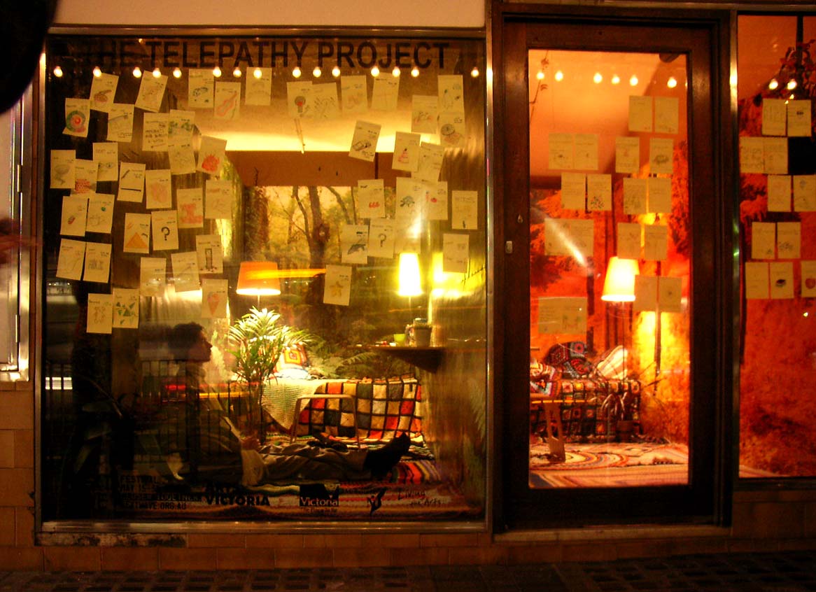 For four hours each night for five days, artists Sean Peoples and Veronica Kent isolated themselves from each other in the front windows of the Forum Theatre, with no way of communicating, other than telepathically. Every 15 minutes the artists wrote down the outcome of their most recent telepathic exchange on time-coded Post-It notes. These notes were stuck on to the glass window for the passing Flinders Street audience to read. This growing archive of notes were written in a stream-of-consciousness, unguarded, honest and confessional style. The notes were on display 24 hours a day for the duration of the show and formed the text of a printed publication produced at the end of the season.